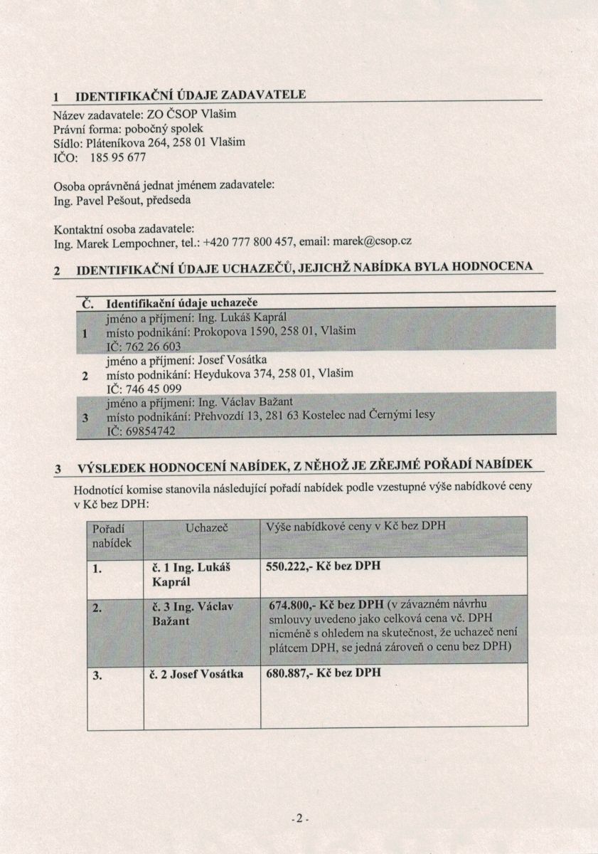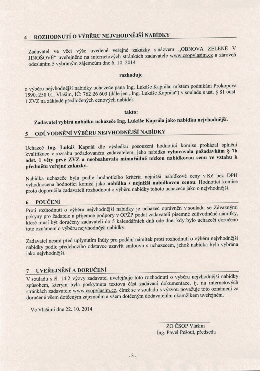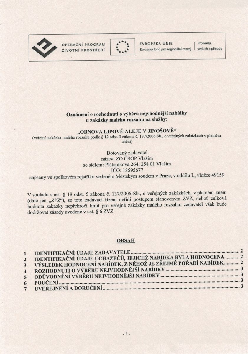 Zveřejňujeme rozhodnutí o výběru nejvhodnější nabídce u zakázky malého rozsahu na služby: „Obnova lipové aleje v Jinošově“
