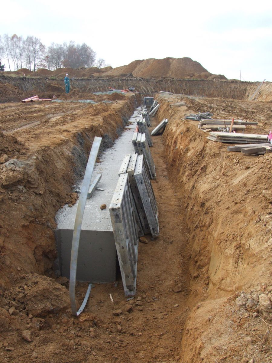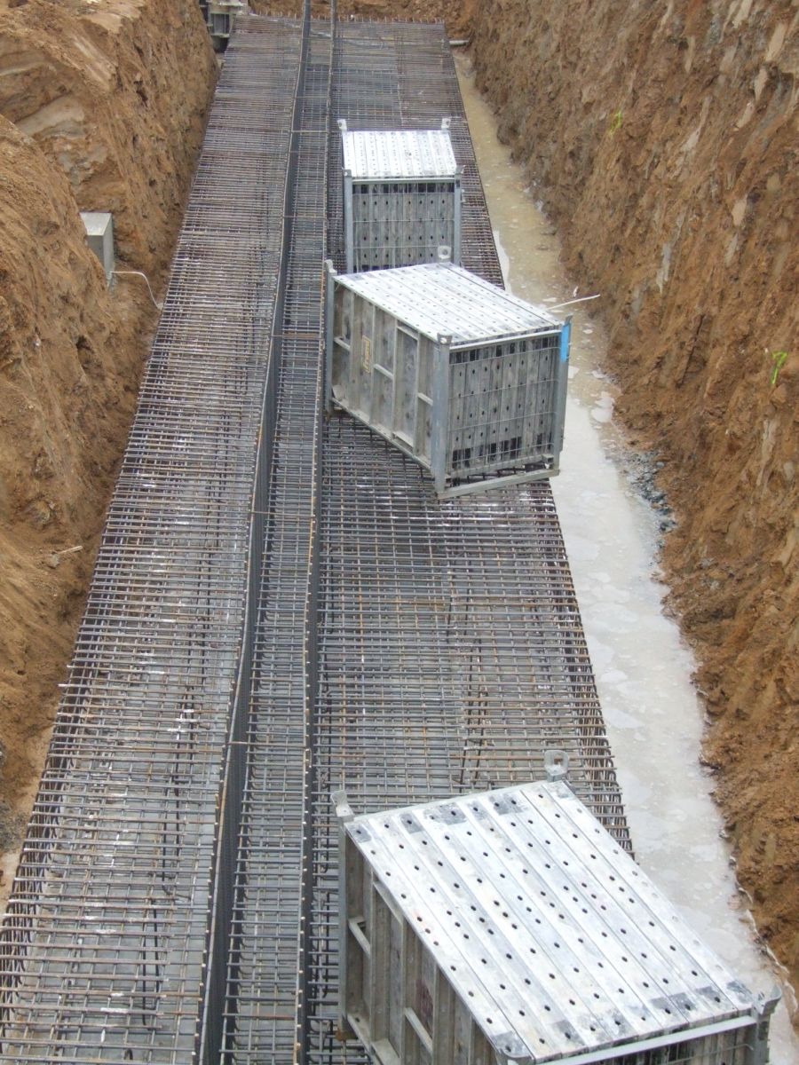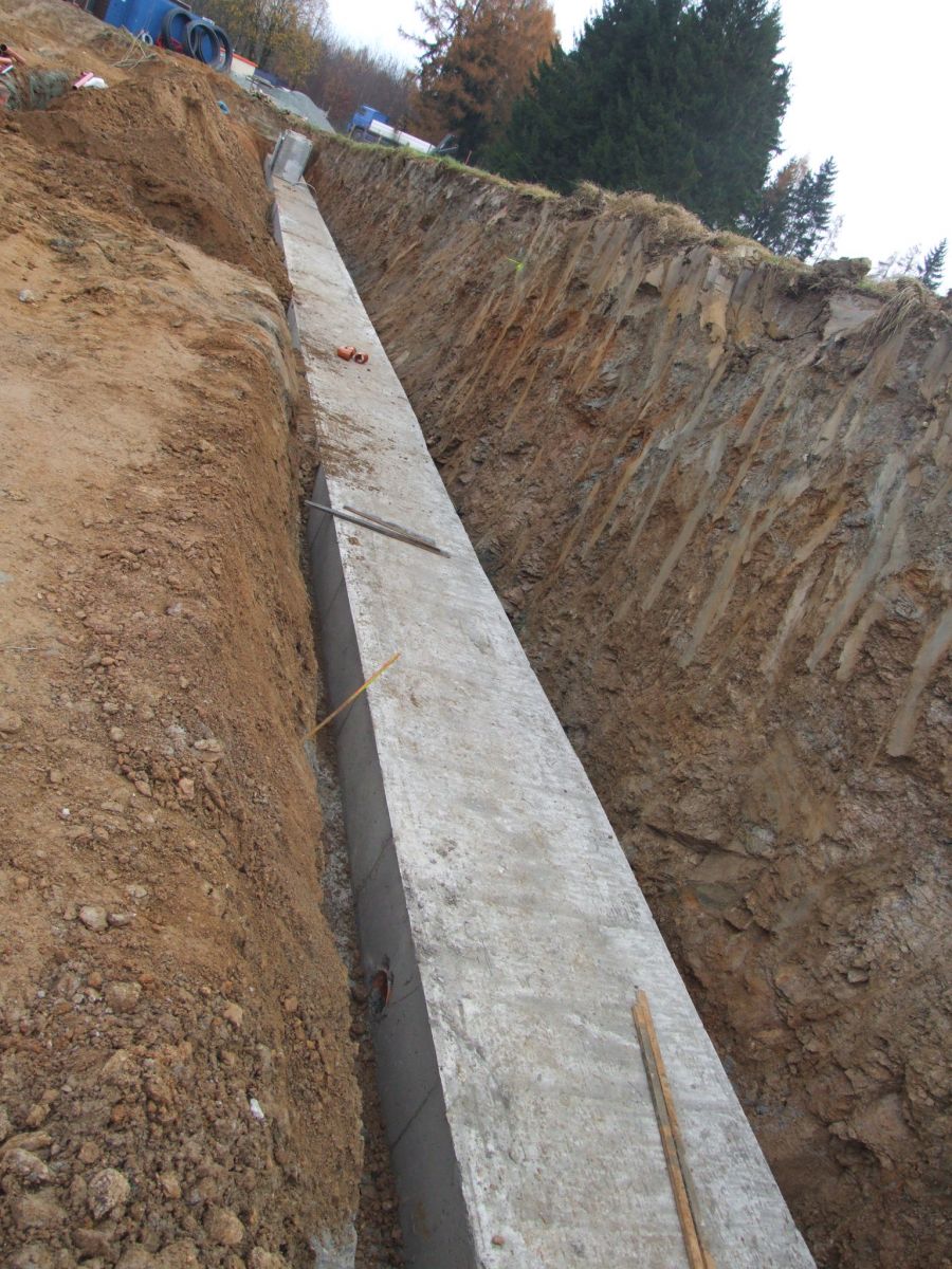 Protější betonový pas. Na něm bude postavena obvodová zeď Vodního domu, obložená gabionem - kovovou sítí, vyplněnou kameny. A protože se nacházíme v Hulicích, bude síť naplněna samými hadci - právě tato hornina se totiž zde na Dolnokralovicku typicky vyskytuje.
