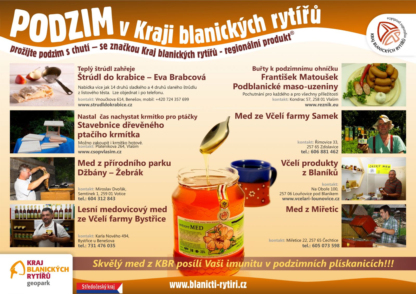 Bohatá nabídka lahodných medů do podzimních plískanic, skvělého jablečného štrůdlu, chutných uzeninových dobrot a dalších regionálních produktů.