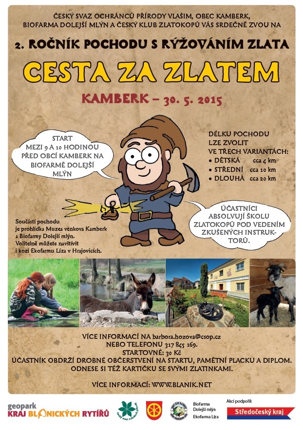 Kamberk. Na sobotu 30. května připravuje Český svaz ochránců přírody Vlašim ve spolupráci s Obcí Kamberk a Českým klubem zlatokopů již druhý ročník pochodu s názvem Cesta za zlatem. Na třech trasách pro děti i dospělé čeká návštěvníky rýžování zlata a setkání se zvířaty na dvou farmách.