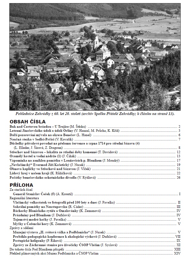 Časopis přináší pokračování o sázavských památných stromech, kdy se zastavíte u buku nad Čertovou brázdou. Dále můžete zkusit pozorovat letouny v Jinošovském údolí nebo zkusit spatřit mývala na okrese Benešov. I o takovém pozorování pojednává poslední číslo devatenáctého ročníku. Nechybí tradiční rubriky o historii ochotnického divadla na Podblanicku nebo informace o nově vydané regionální literatuře. Tu můžete zakoupit, stejně jako časopis Pod Blaníkem, v Ekoobchůdku Podblanického ekocentra.
