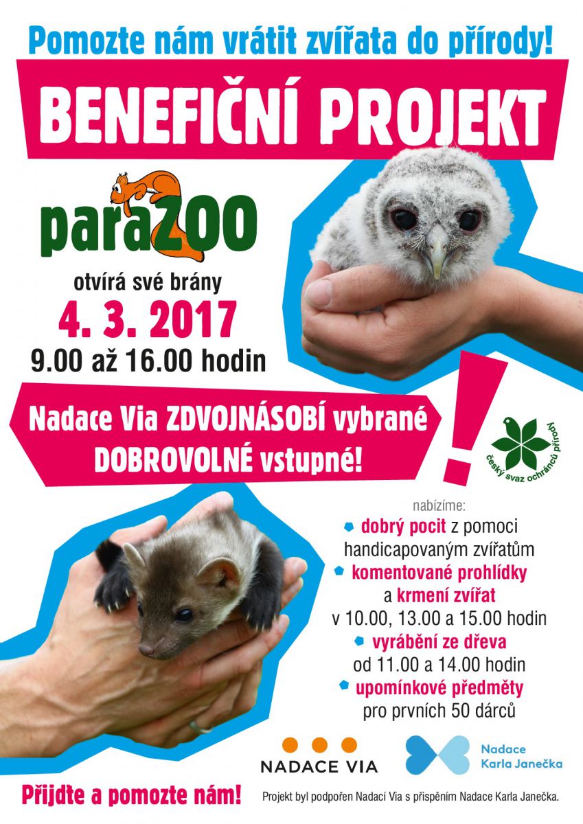 Vybrané dobrovolné vstupné bude věnováno na činnost Záchranné stanice pro živočichy ČSOP Vlašim a jeho konečnou výši Nadace Via zdvojnásobí až do výše 15.000 Kč. Brány paraZOO budou dárcům otevřeny od 9.00 do 16.00 hodin.