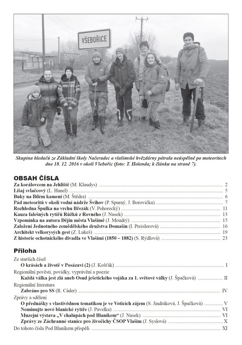 Z dalších článků si nenechte ujít pátrání místních nadšenců po meteoritech, které dopadly do okolí vodní nádrže Švihov nebo vzpomenutí na dobu autora Dějin města Vlašimě v článku Josefa Moudrého.