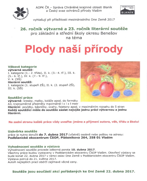 Správa Chráněné krajinné oblasti Blaník ve spolupráci s ČSOP Vlašim pořádá letos další ročník tradiční soutěže k dubnovému Dni Země 2017. Soutěž, která má literární a výtvarnou část, je určena pro žáky a studenty základních a středních škol okresu Benešov.
