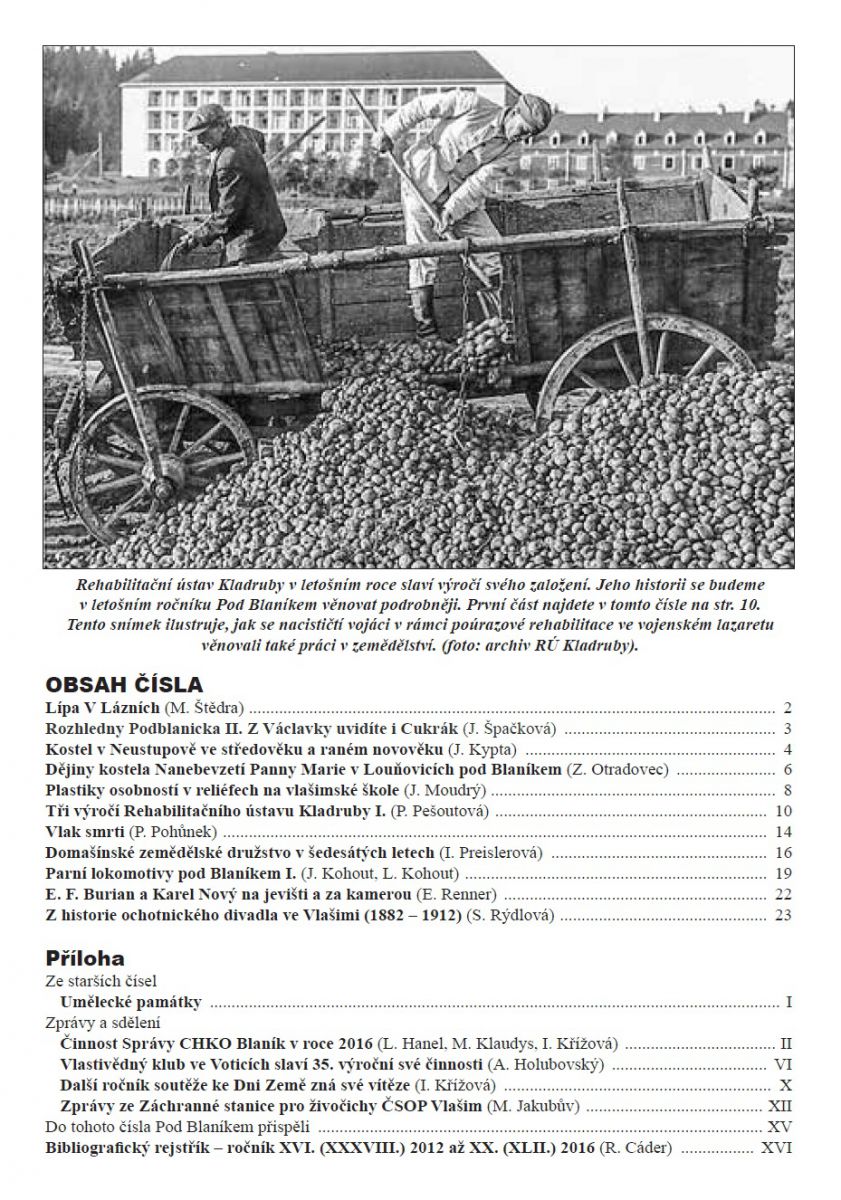 Časopis Pod Blaníkem č. 1/2017 nabízí exkurzi do dvou kostelů na Podblanicku - kostela v Neustupově a v Louňovicích pod Blaníkem. Historii těchto staveb je doprovázena dějinami 20. století v článku o Rehabilitačním ústavu Kladruby u Vlašimi nebo ohlédnutí za historií zemědělského družstva v Domašíně. Jaké jsou výhledy do kraje nabídne pokračování seriálu o rozhlednách Podblanicka.
