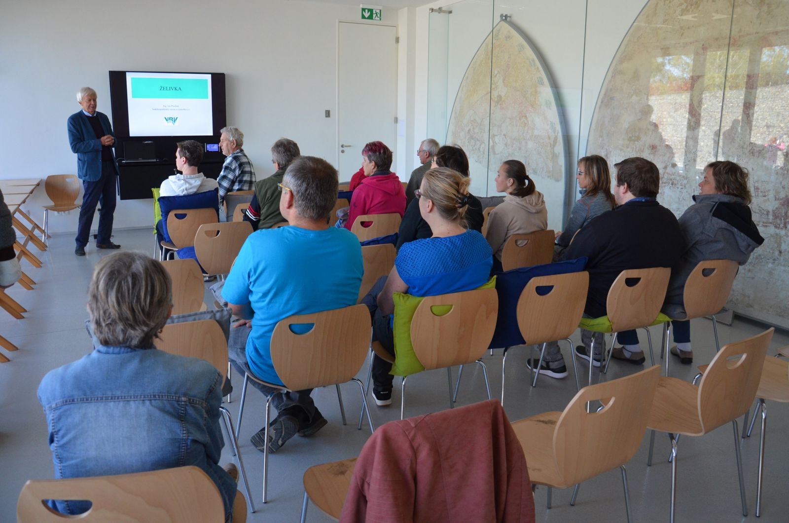 Na přednášku o historii stavby přehrady přijal pozvání Ing. Jan Plechatý, který na stavbě pracoval od roku 1969 ve funkci technického dozoru a vedoucího Technické dozorčí správy v Nesměřicích a poté v pozici vedoucího útvaru stavby VD. Velmi poutavě vyprávěl o celé stavbě, promítal dobové fotografie a neúnavně odpovídal na zvídavé dotazy posluchačů.