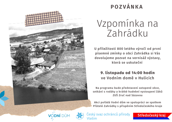 Zaniklá obec Zahrádka je neodmyslitelně spojena s vodní nádrží Švihov-Želivka. Dnes po ní na břehu přehrady zůstal jen opuštěný, přesto však významný kostel. „K přehradě se stále vrací lidé, kteří zde žili. Jim a všem, kdo se zajímají o historii, chceme nabídnout krátké podzimní zastavení a zamyšlení nad zaplacenou cenou za tento zdroj pitné vody – vodní nádrž Švihov,“ uvedla Veronika Dušková, lektorka návštěvnického střediska. Vernisáž výstavy začne ve 14:00 hodin a program naplní setkání s pamětníky a krátké hudební vystoupení žáků ZUŠ Zruč nad Sázavou. Nebude chybět ani drobné občerstvení.