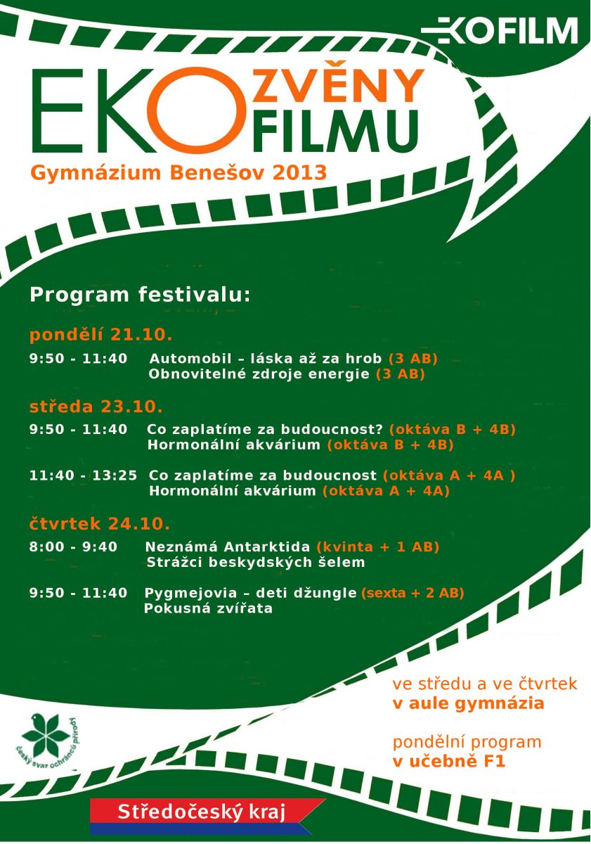 Podblanické ekocentrum ČSOP Vlašim pořádá ve spolupráci s Gymnáziem Benešov filmový festival Ozvěny ekofilmu pro studenty tohoto gymnázia ve dnech 21., 23. a 24. října.